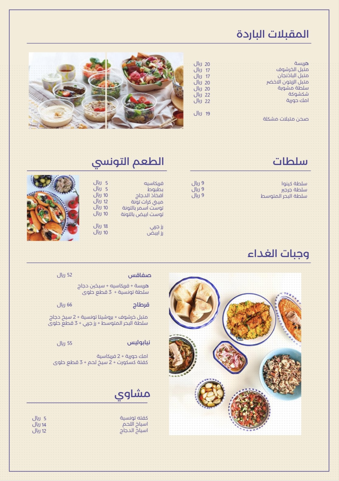 النوع: مقهى – حلويات – قورميه فرنسي وتونسي، ويقدم وجبات ومنتجات تونسية