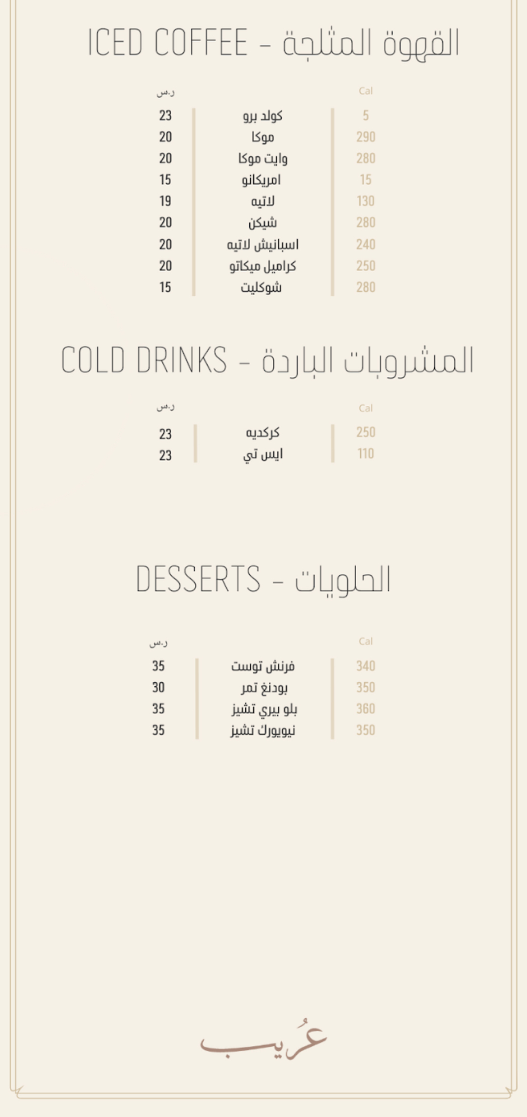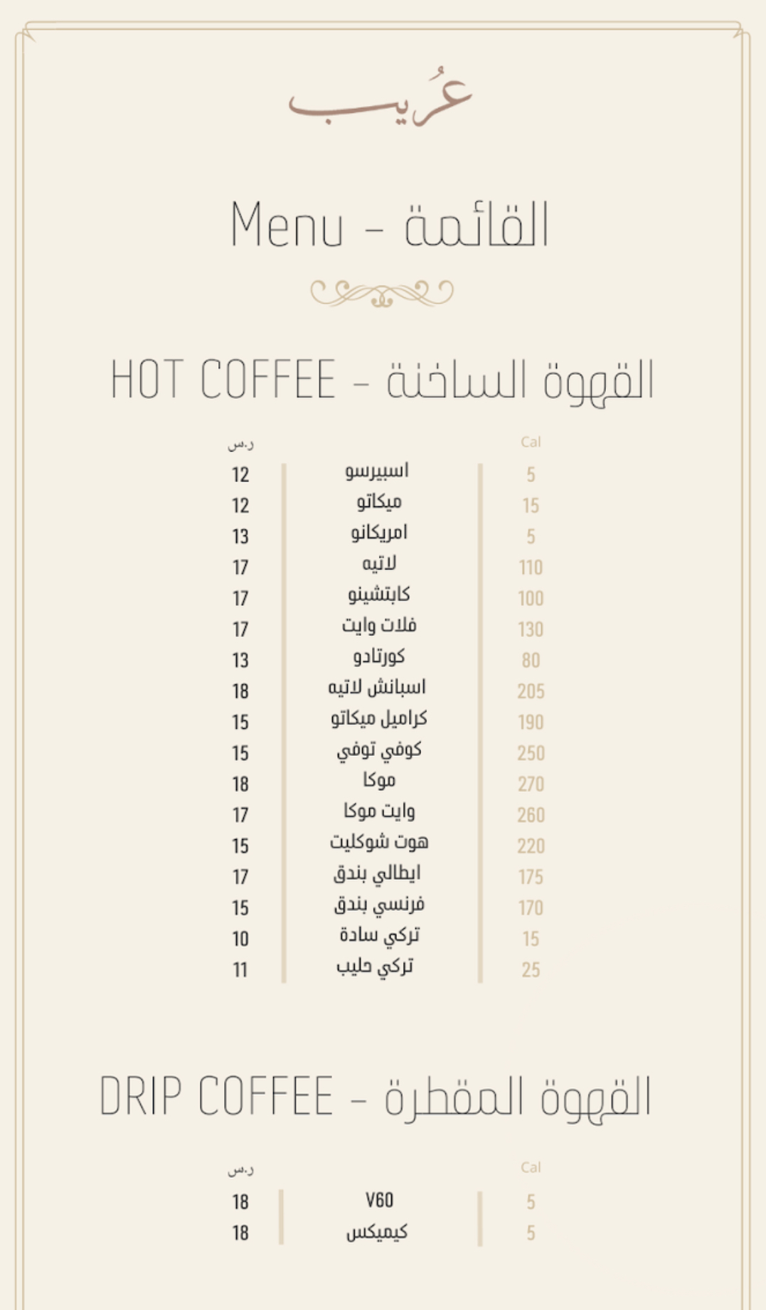 منيو كافيه عُريب بالمدينة