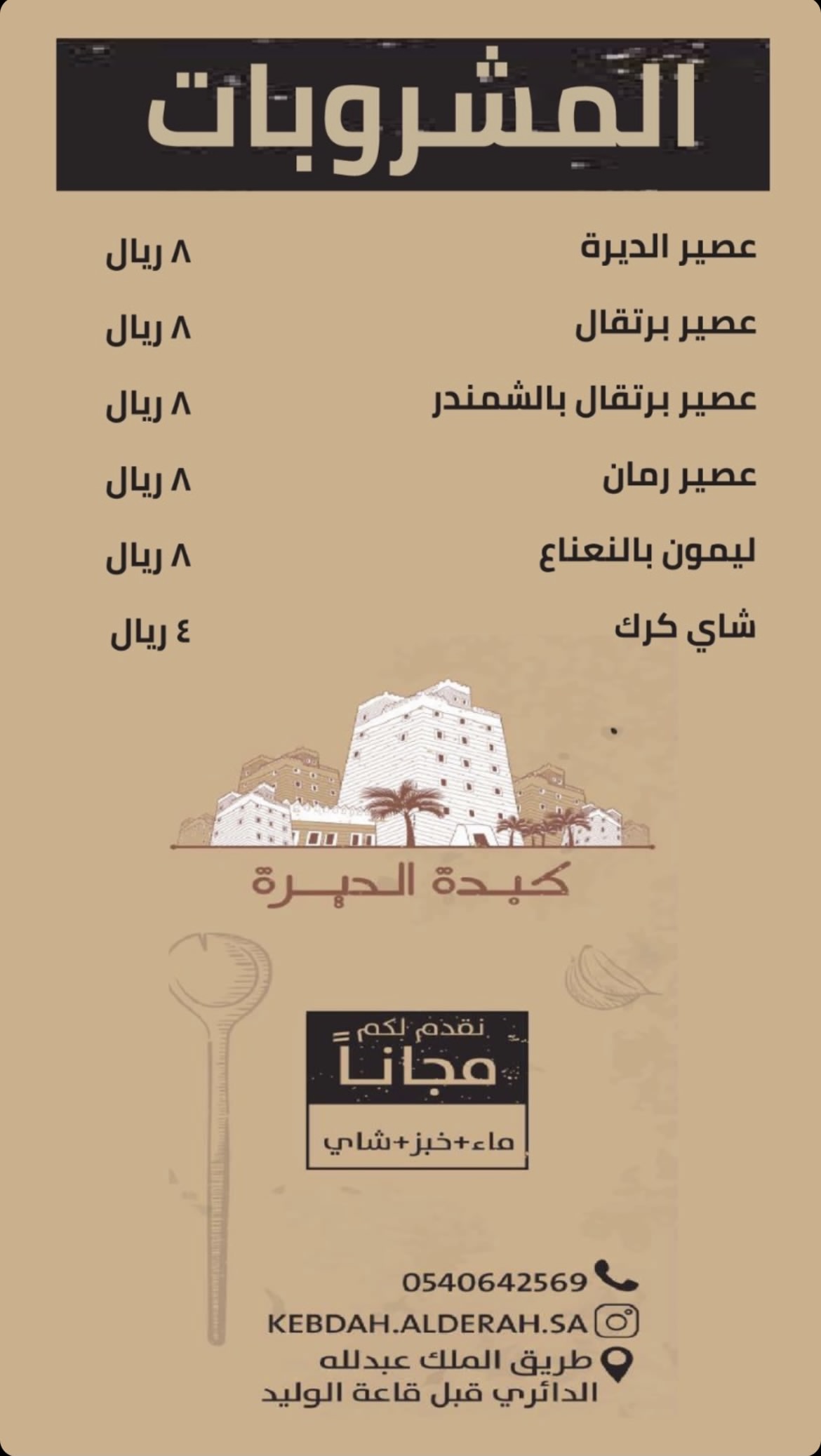 جربت كبدة الديره مميزه وطعمها لذيذ ودرجة استواء الكبده ممتاز جداً.